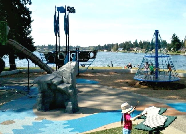 Lake Meridian in Kent has a park that has a pirate theme, with a pirate playship and all. It is also not far from the swimming area of the lake, so your kids can enjoy sand play as well as playground play here too (fields to toss a ball or frisbee on as well). There is also a dock if you want to get some fishing in for the day.