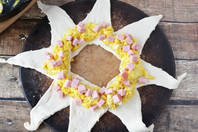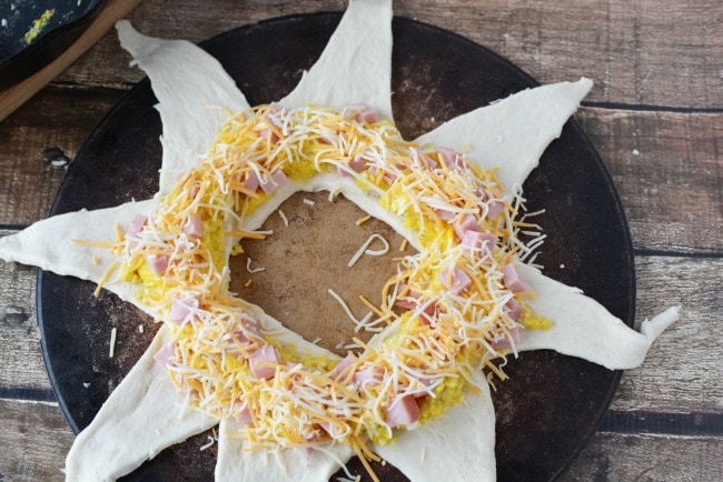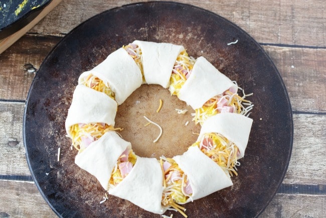 - Fold the top over the ham, eggs and cheese to the center of the wreath and press in