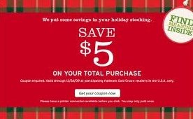The $5 off Hallmark coupon is back again this year! There are a number of December issues of magazines with the new $5 off your purchase of $5 or more Hallmark coupon. Bring this coupon to Hallmark stores & you should be able to find several items for FREE or cheap in this price range. Last year, I bought two rolls of wrapping paper for $.99 & it looks like that deal is back again. You can get 2 rolls of wrapping paper for $5.99. These are the premium rolls too – they’re $4.99 for 1 roll & if you buy 2, the 2nd one is $.99. So, with the $5 off coupon, it would be $.99 total for 2 premium rolls of wrapping paper.
