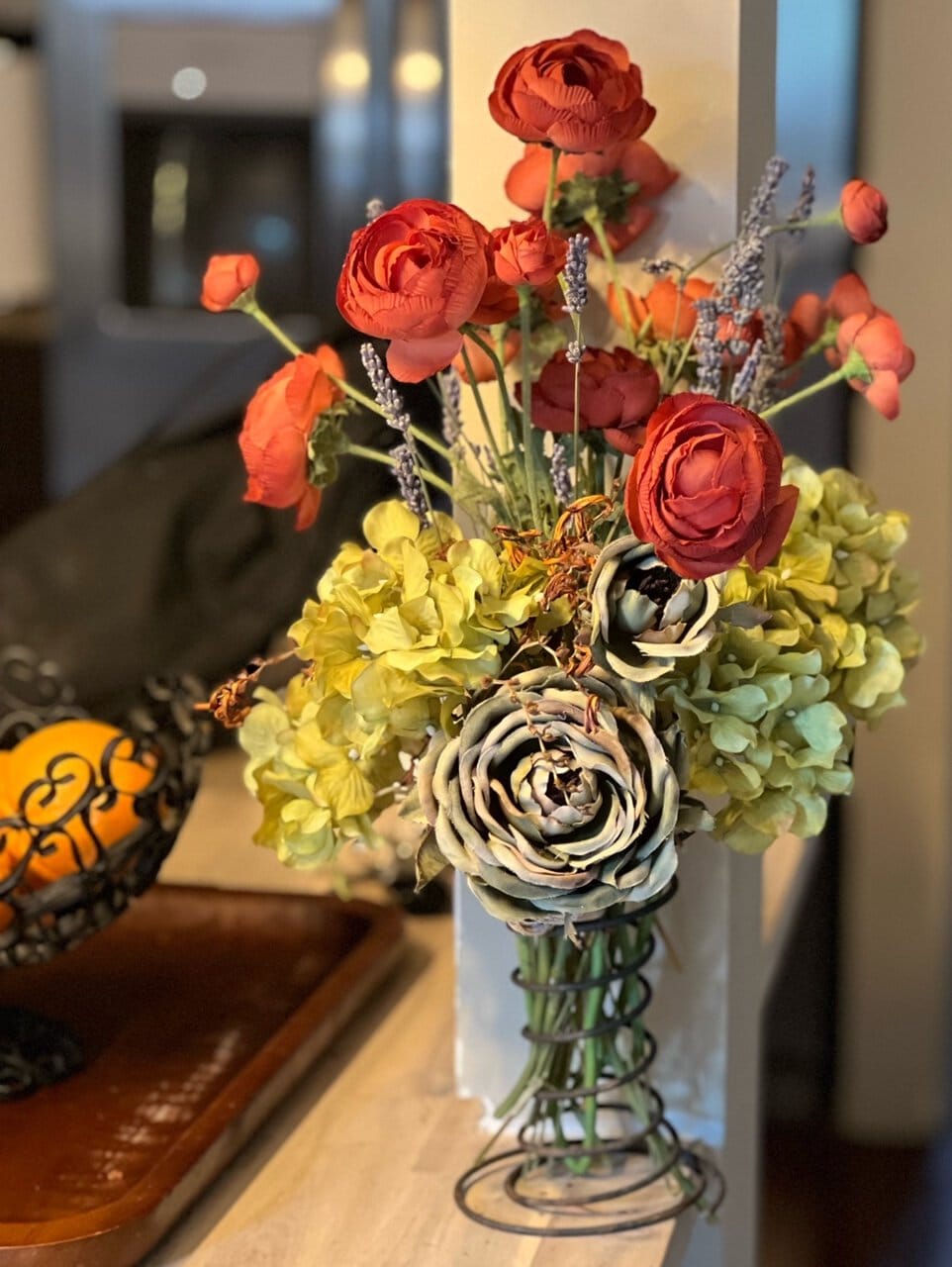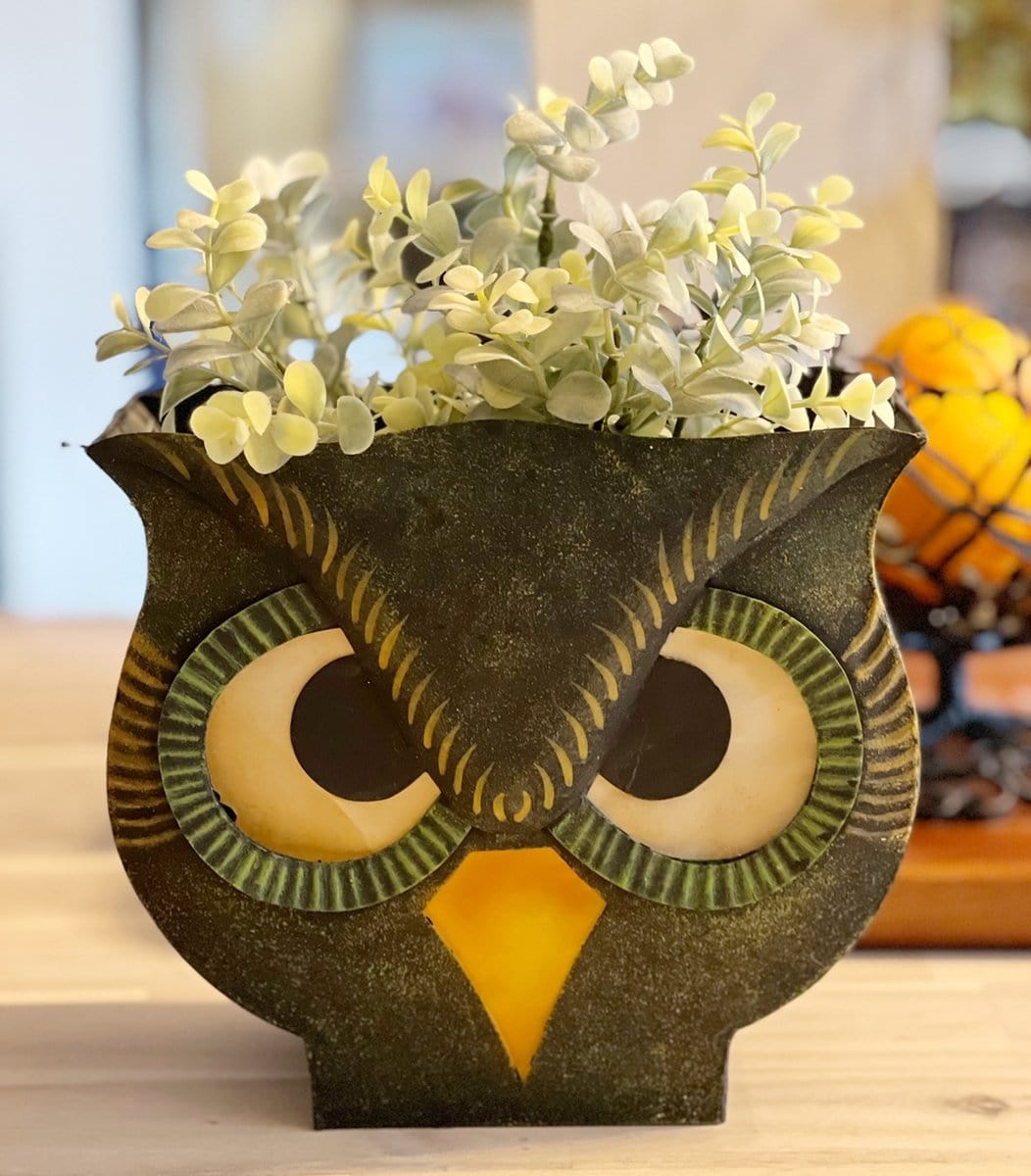 You can even use faux flowers and dried ones for these arrangements. The fall bouquet at the top is made of faux flowers we picked up at a thrift store, and this one here is a metal owl candle holder I found at a thrift store for $3! I took the candle out and put a faux plant in, and love it in the fall.