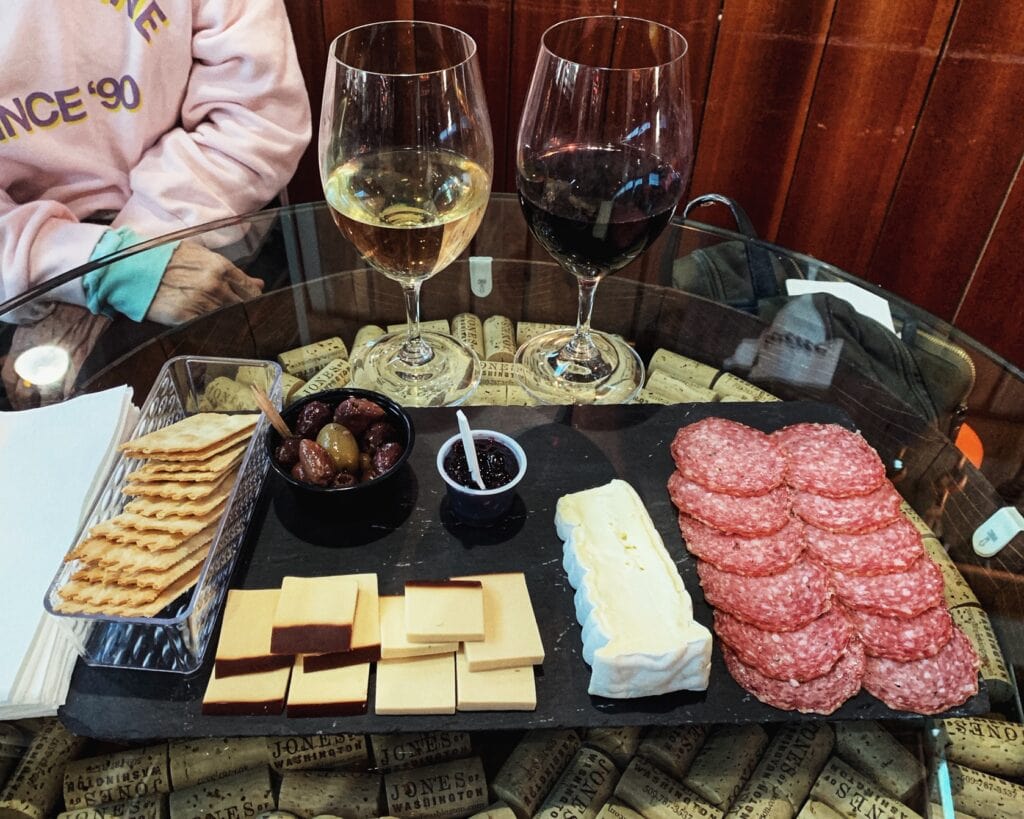 This is the cheese and meat If you are just looking for a snack or light lunch, we ordered this fun cheese and cracker platter from the Pybus Cheese shop (and a big pretzel for the kids too), and they delivered it right next door to the Jones of Washington Winery area (kids are welcome), so we could pair it with a glass of wine for the adults.