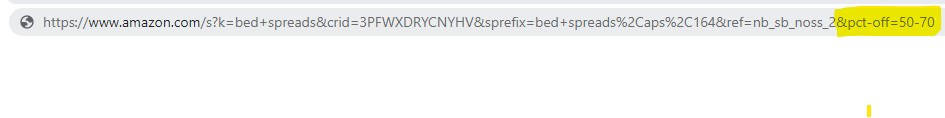 - To find items that are a certain percent off, start by searching for the item you want. Lets say you are looking for bed spreads. Search for those in the Amazon search bar. Next you will add a string to the end of the URL, with the percent off you want to sort them by adding this &pct-off=50 (change the 50 to the percent off you want to sort by). Here is an example of adding that to the end, when wanting to sort by 50% off.