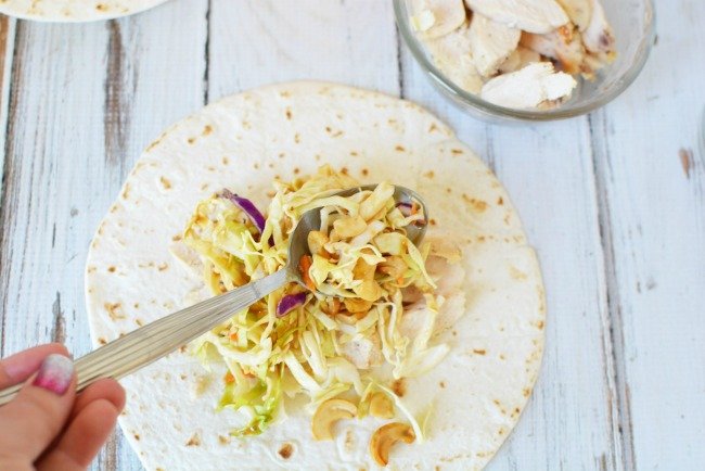 If you are looking for a super easy lunch time recipe, or a great meal for a busy weeknight, try this Asian Chicken Wraps Recipe. You can really use any type of chicken in them. We often make them with baked chicken breasts, but you can use rotisserie chicken or breaded chicken as well to keep it really simple! The chicken strips add a nice crunch to the wrap and the flavors blend together so nicely. If you want to keep it on the healthier side, you could use whole wheat tortillas, and rotisserie chicken or baked chicken.
