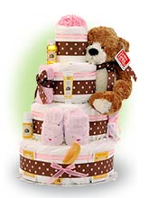 The idea of a diaper cake is you stack rows up diapers and secure them with decorative ribbon to achieve a ‘cake like’ look. I usually cover some cardboard for my base, and stuff in extra items (like the blankets and bibs – you can roll them up and tuck them into the cake). You can get instructions on how to make a diaper cake here. One diaper cake, purchased online will likely cost you more then the $175 worth of merchandise for 70% off would cost, and you could make multiple cakes out of that (plus the cost of the diapers).