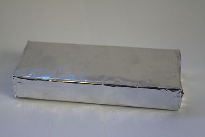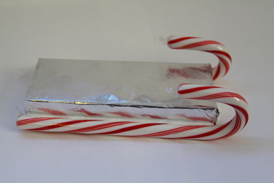 Next, glue the candy canes onto the wrapped Junior Mint box. I used craft glue for this, but you could use hot glue as well. I don’t have a hot glue gun, but I’m hoping Santa is going to bring me one.