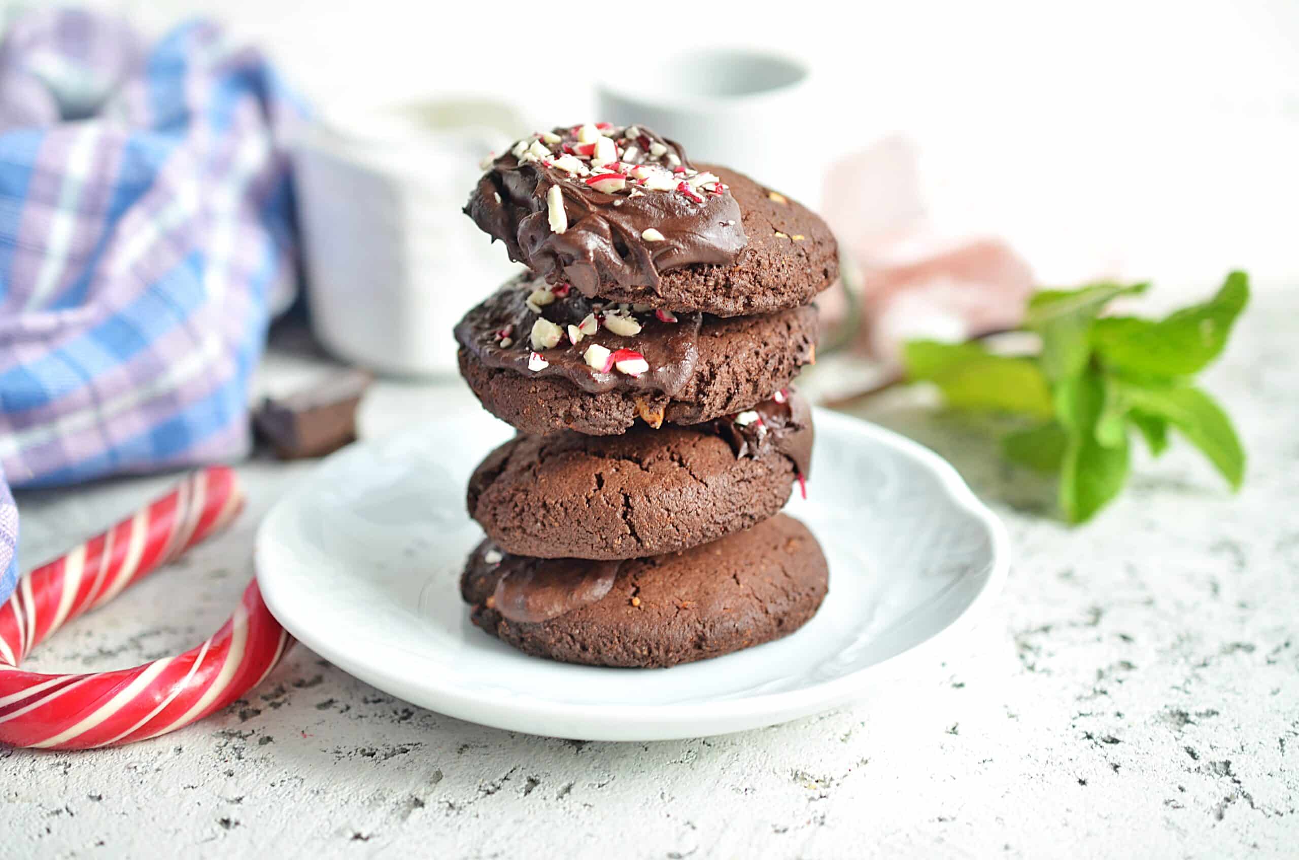 These fun festive cookies are perfect for Christmas. They are chocolatey with a peppermint flavor added, and a topping that mimicks those flavors too!