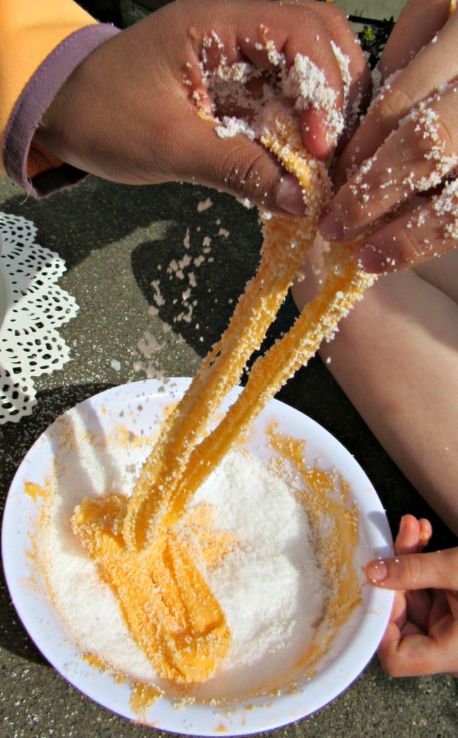 You can see in this picture, where one of my kids is stretching the slime, it has a “less stretchy” consistency, and more a grainy texture.