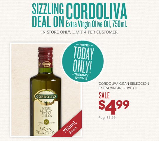 Cost Plus World Market is offering this Cordoliva Extra Virgin Olive Oil for $4.99 per 750 ml bottle. They are regularly $6.99. You can purchase up to 4 bottles per customer, and offer is available today only (10/23), and in-store.
