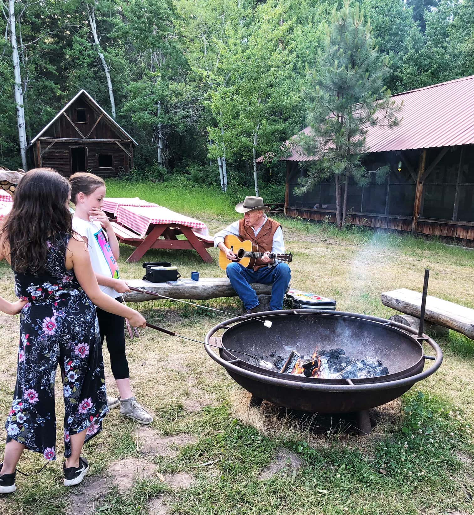 My girls roasted marshmallows for s’mores and ate the apple crisp and whipped cream. I tried to avoid the desserts but ended up cleaning up their leftovers. It was delicious. As dinner was winding down, one of the cowboys took out his guitar and started playing some music around the fire. It was a nice touch to create a down-home feel for the evening.