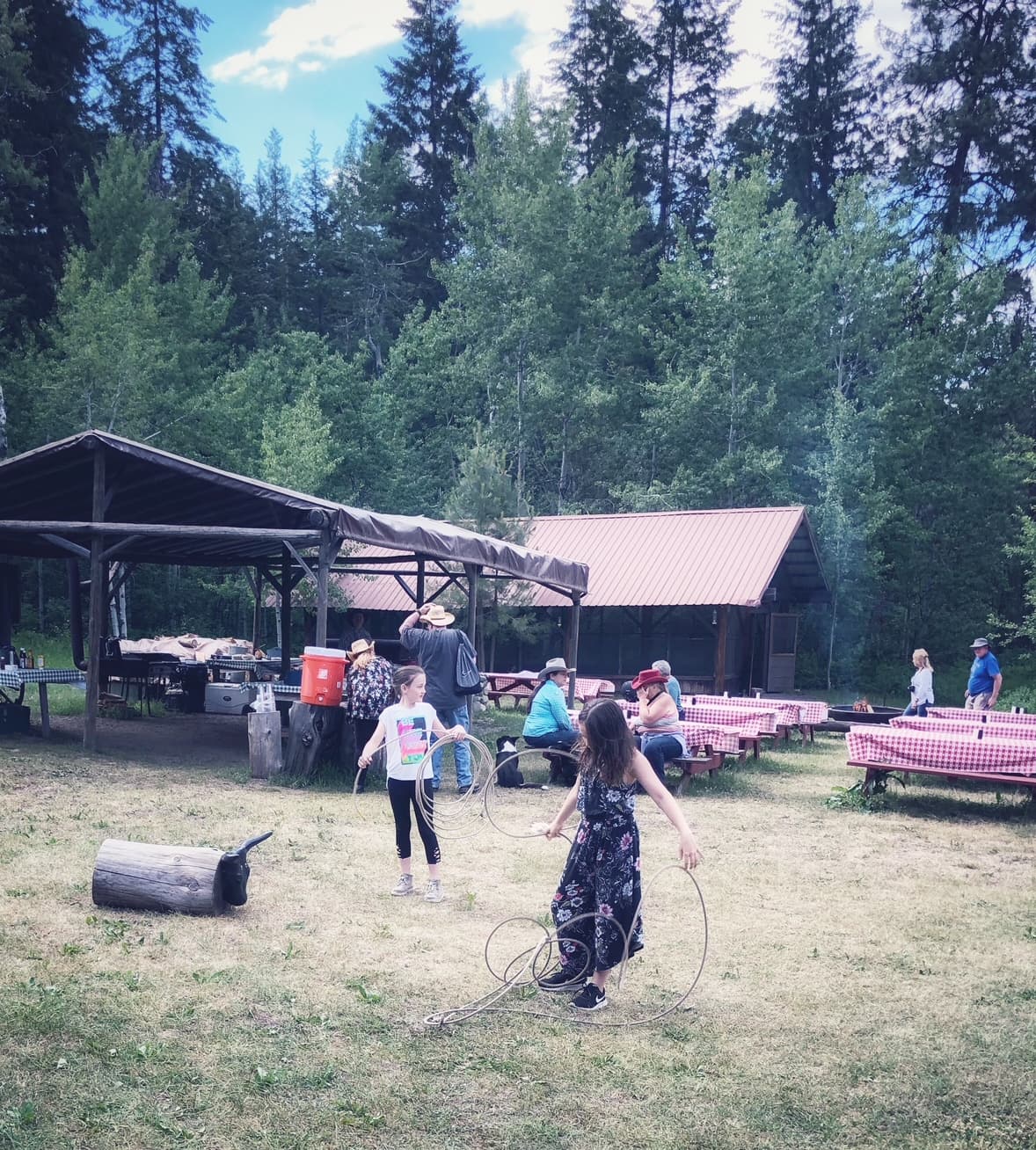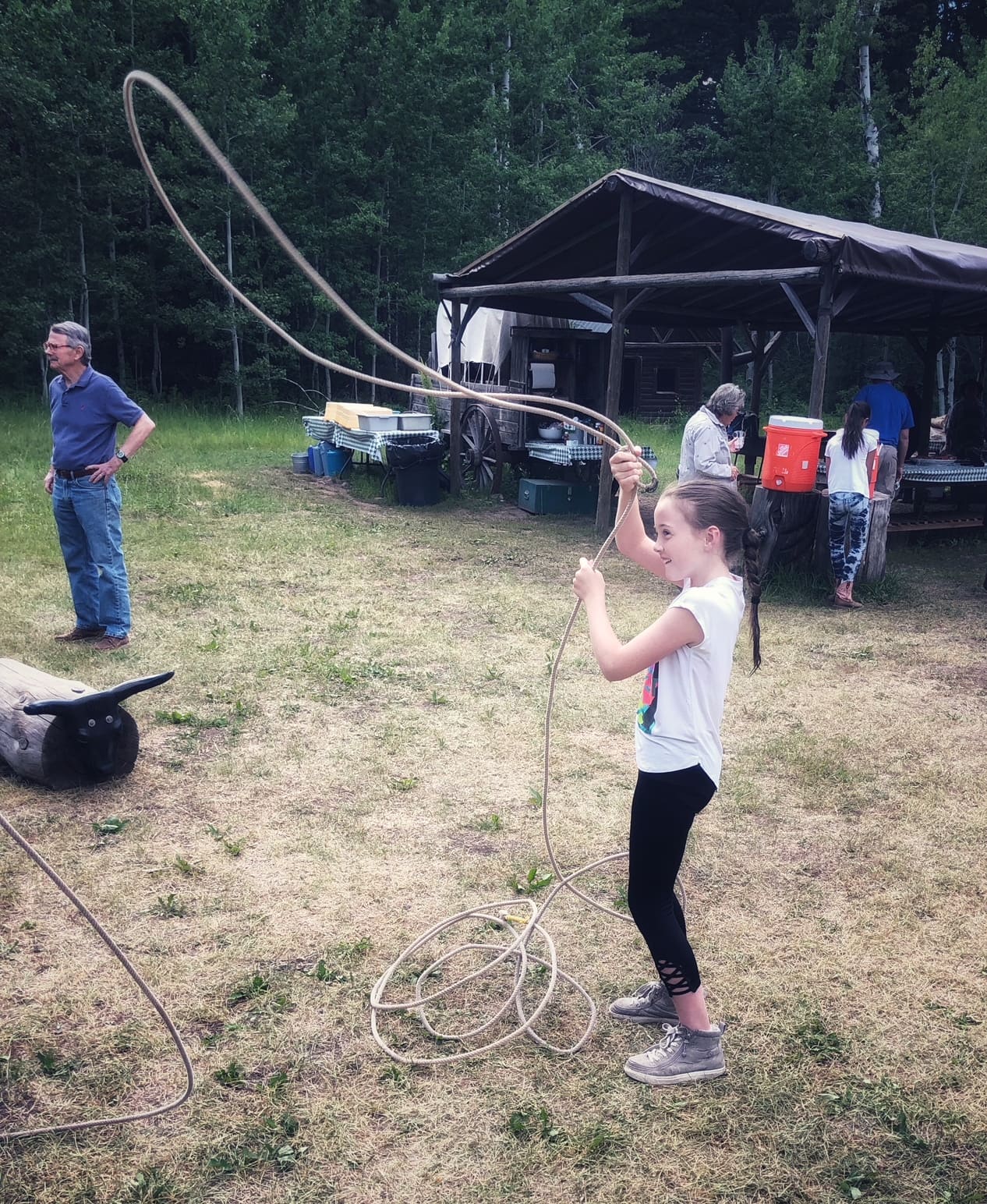 After dinner, another one of the cowboys taught the kids how to toss a lasso to try to rope the fake bulls on the logs. My girls loved this and only stopped when it was time to share a turn with another kiddo who wanted a try. By the end of the night, you even saw some of the adults trying to ring the fake bull!