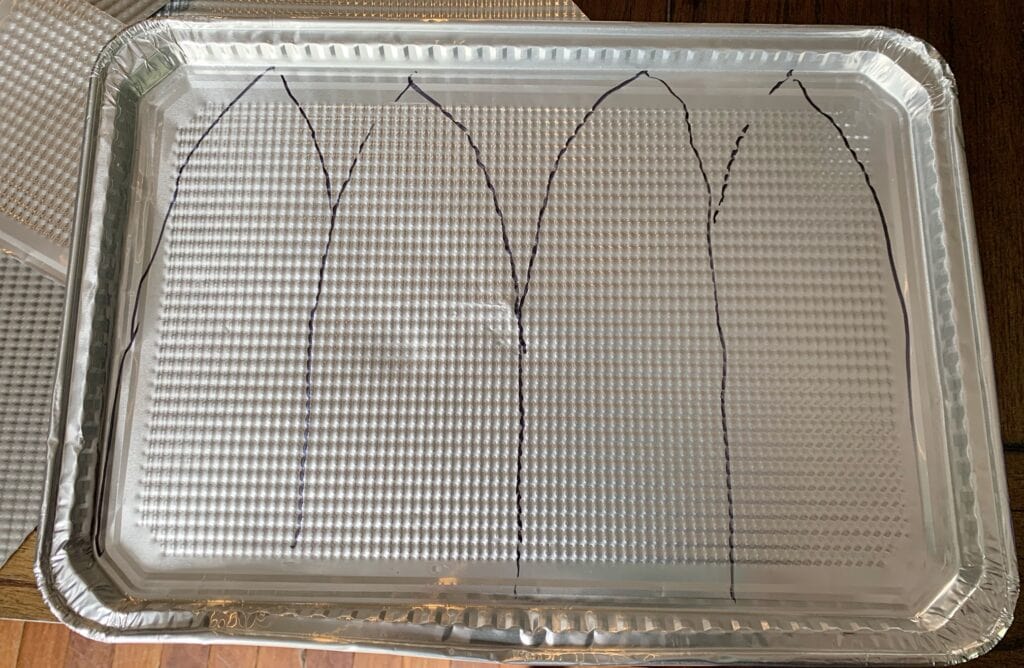 And then I cut the size down one more time, and flipped the cookie sheet so I could fit 4 leaves on one cookie tin, for this last set of leaves. For this leaf, 2 cookie tins yield 8 leaves.