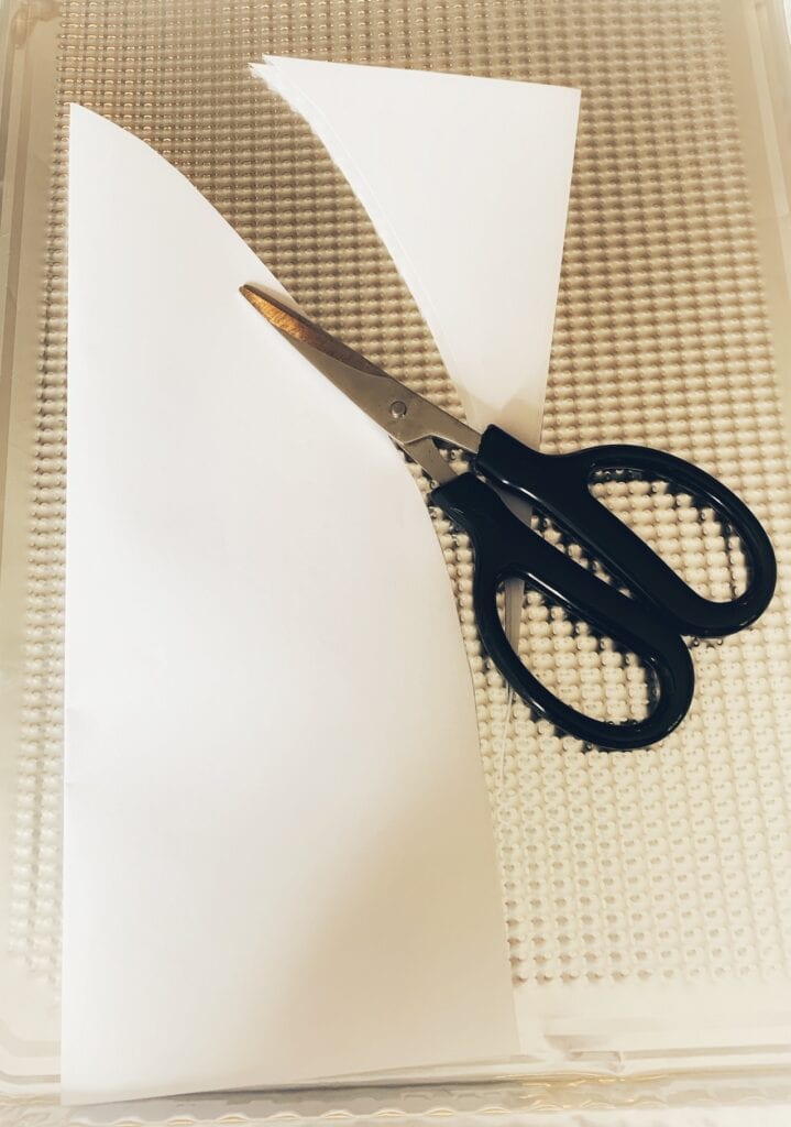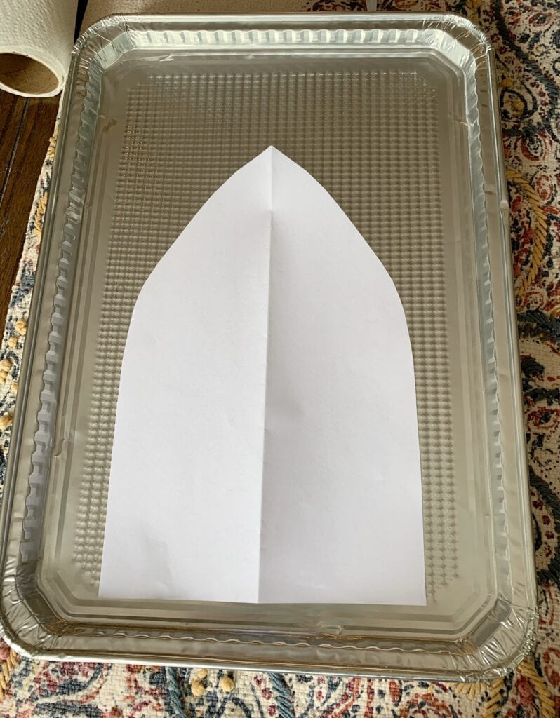 The first thing you will want to do is to create a template of a petal to cut out of your tin cookie sheets. I kept mine simple. For this daisy flower look you can just use a piece of 8×10 paper, and fold it in half, then cut out the shape of a petal like shown above. If you prefer you can google flower petal templates too, and use those.