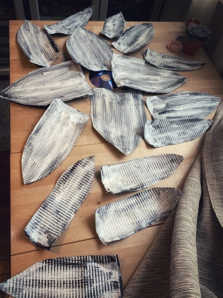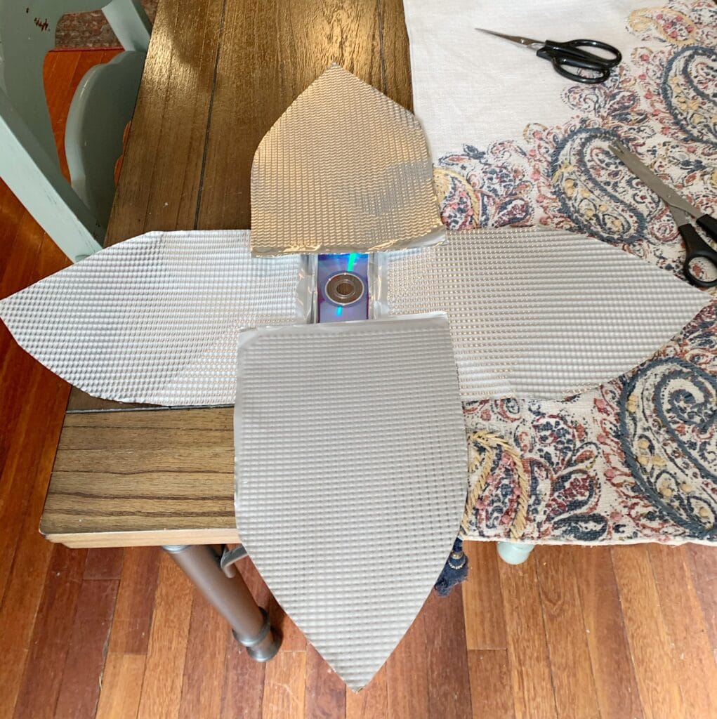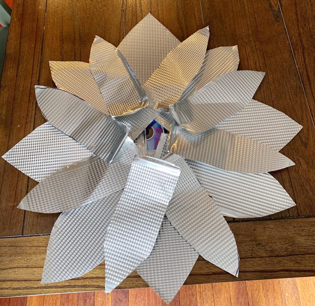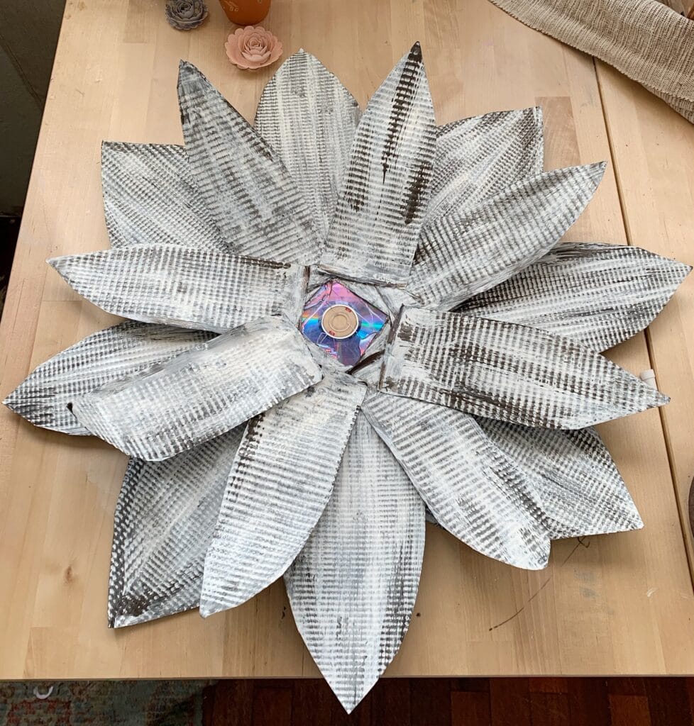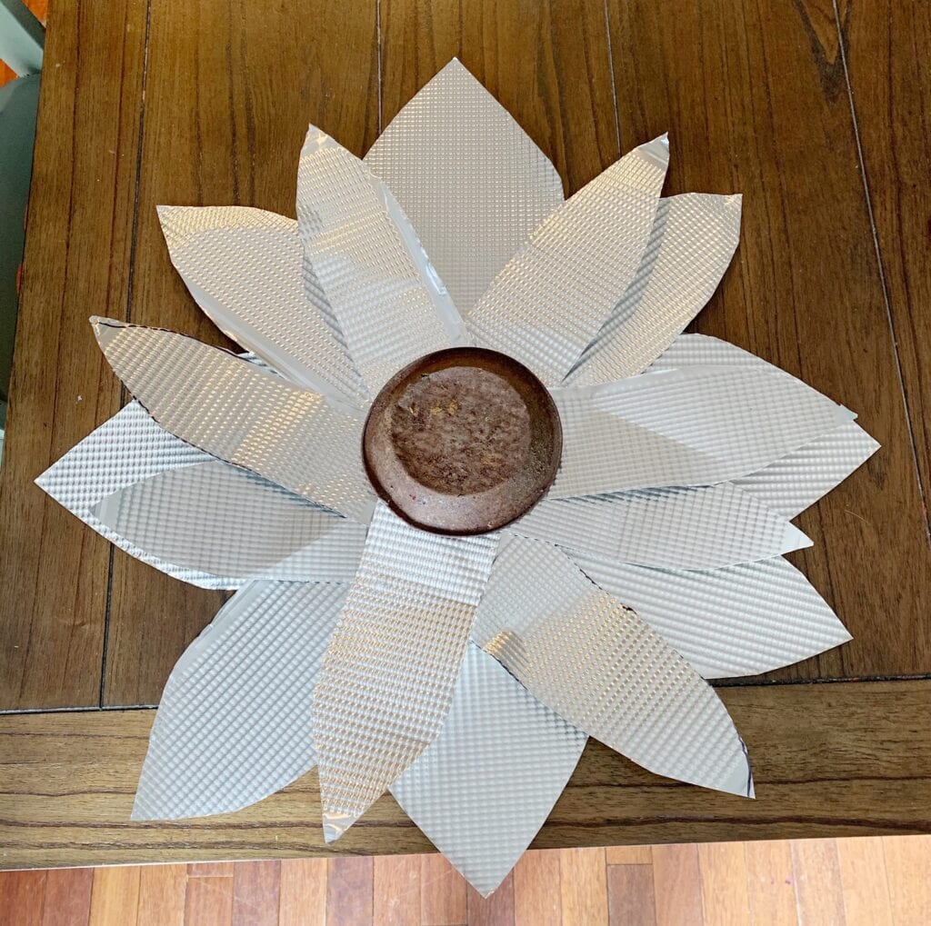 Cut out your first four larger petals and place them on the centerpiece to get an idea of the size of your flower. We used an old CD, but you could use anything that is this shape that you can glue the petals too. If you are using it indoors you could even use a cardboard circle.