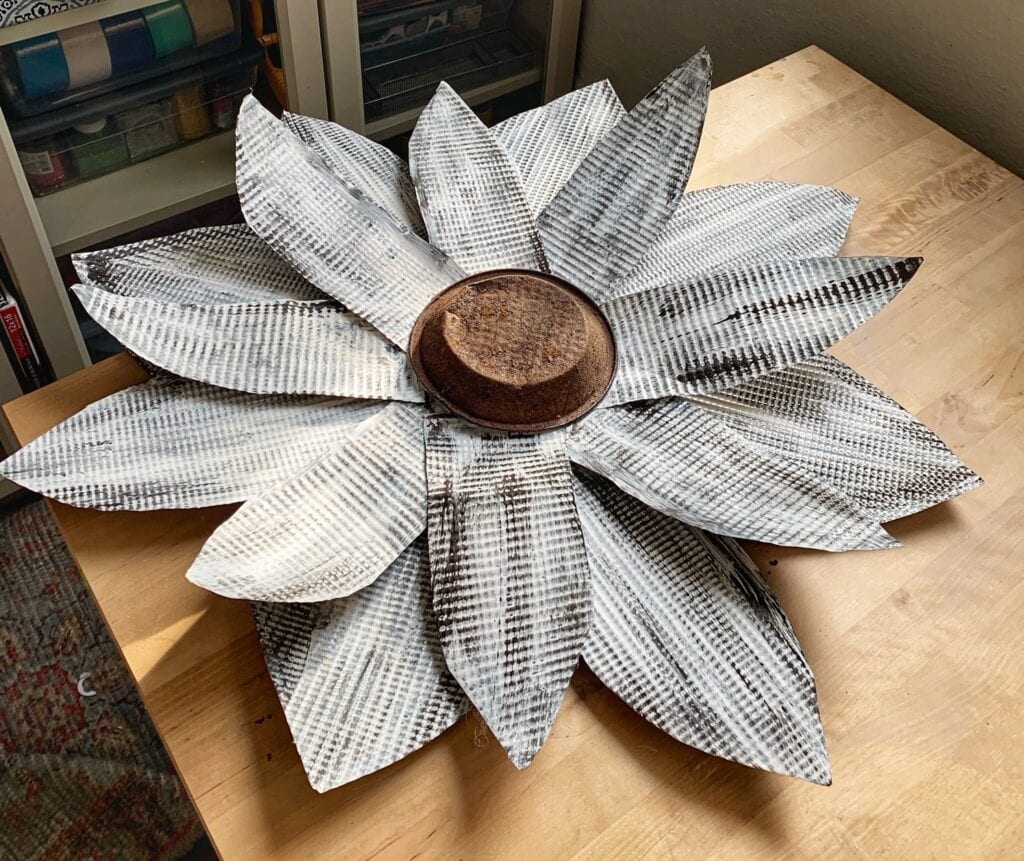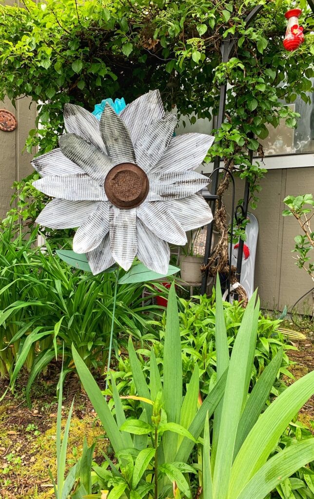 These tin flowers can be used in the garden, or hung on your front door, or from a wall in your home. Here is what the flower looked like when we were done with it, but before we mounted it to a post to put in the garden. You could glue ribbon or a picture hanging kit to the back of this flower instead of putting it on a post, and hang it on a door or wall in your home too. I love how it is so versatile and you can use it to decorate in so many places. Because it is made of tin, it is very light too, so it is easy to hang.