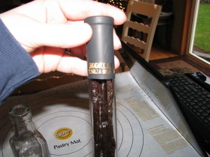 The site we got our beans from said: “We suggest using more beans in order to ensure that you get a strong enough extract when you are done – at least two ounces of beans for a pint of extract.” Which was about 10 beans per pint (1 gallon = 8 pints so 1/2 gallon = 4 pints) so we did 40 beans per half-gallon of alcohol.