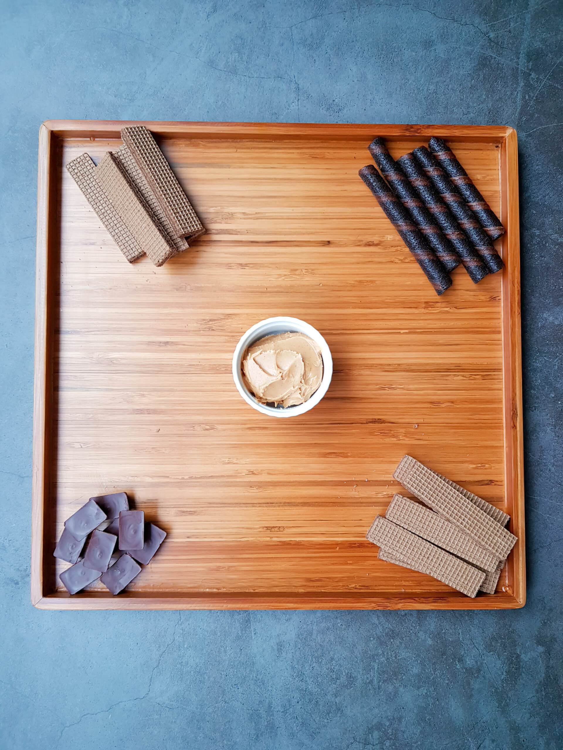 Then add a handful of 4 different items to the 4 corners of your tray. We used chocolate wafer cookies in two corners opposite each other, then chocolate wafer rolls and chocolate bars in the other two corners.