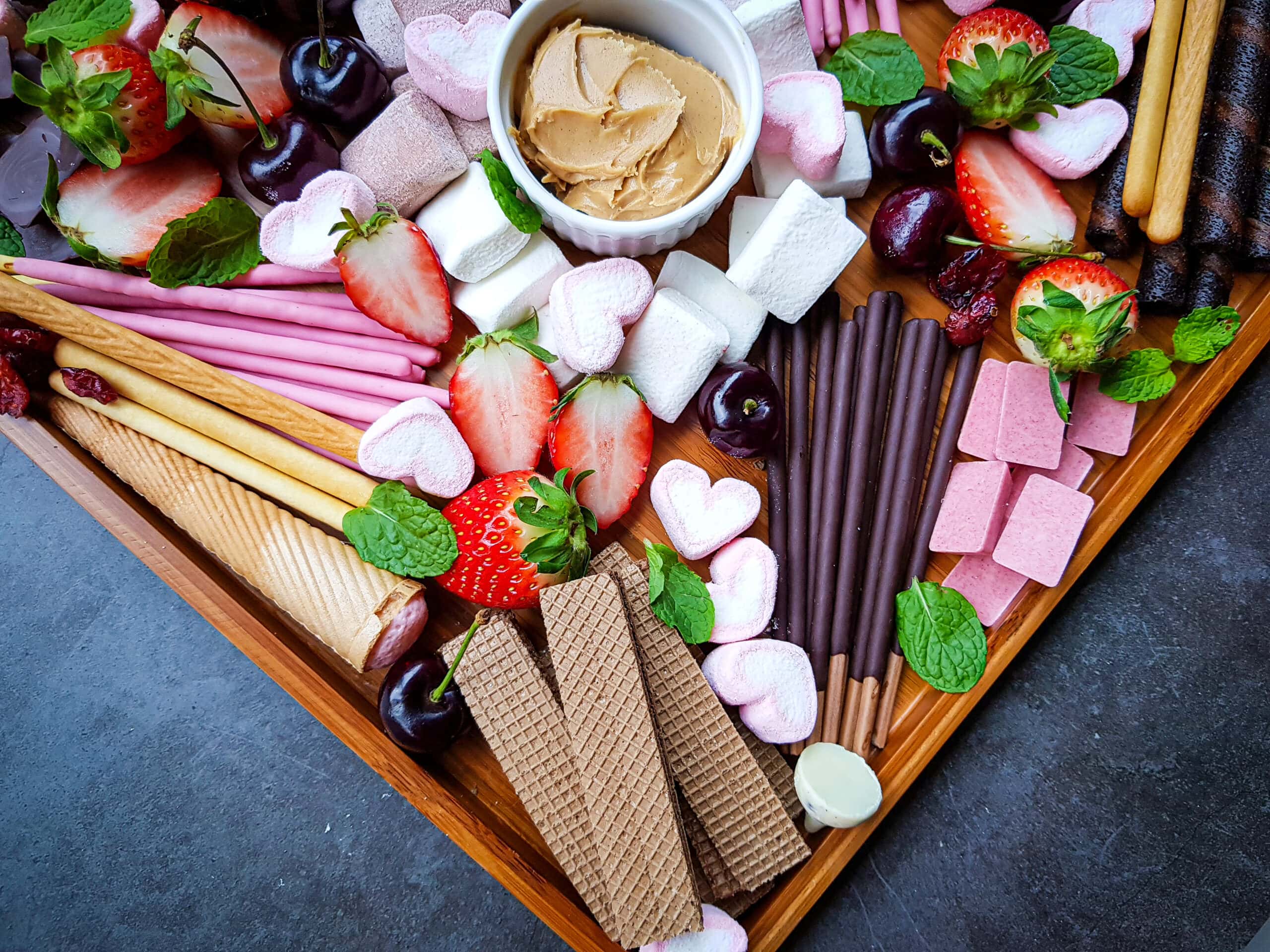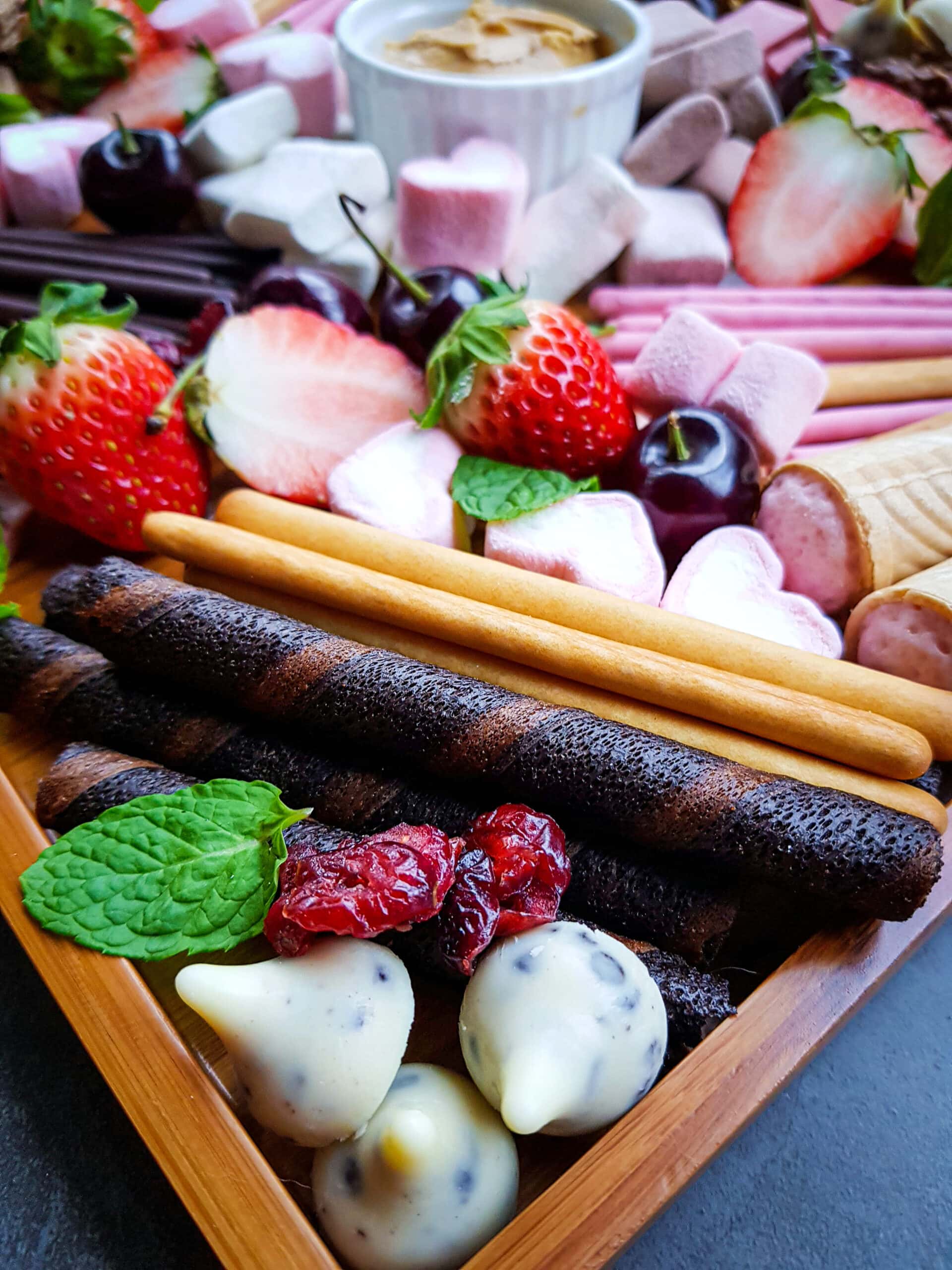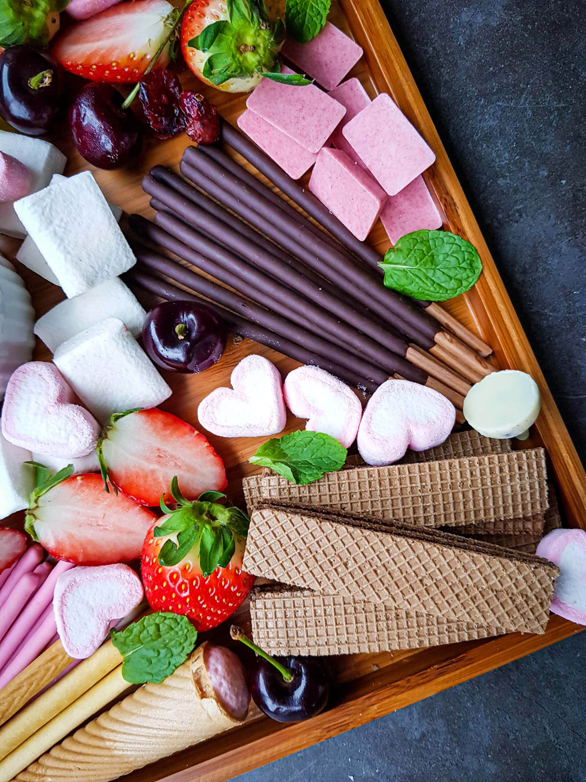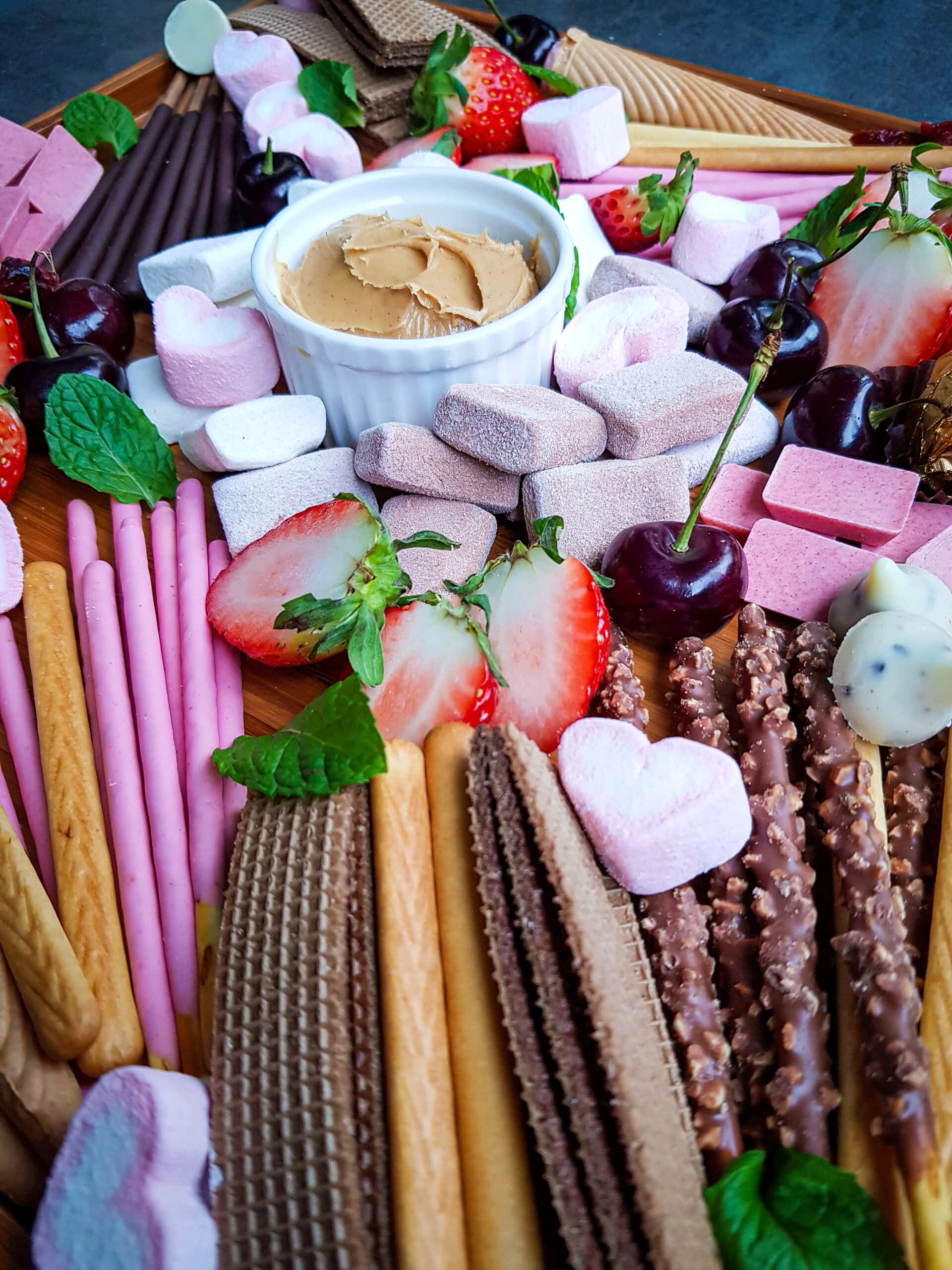A traditional charcuterie board typically is a mix of cured meats and cheese with some other items (like crackers, spreads and olives for example). In this case we are making a dessert charcuterie board, and these usually include a variety of sweets and spreads. Because we are doing this one for Valentines day, we included sweets and fruits that tie in to that theme here.