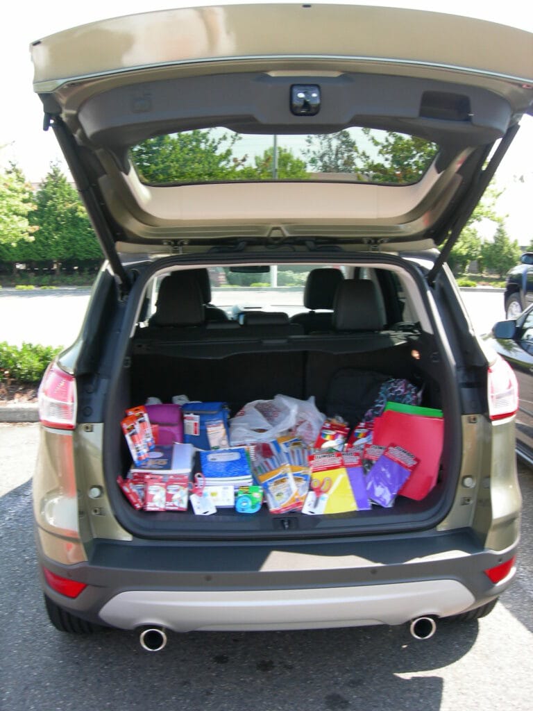 The supplies you see in the escapes cargo space above will be going to kids in the Tacoma school district who do not have supplies. Jen’s husband is a teacher in that district, and they have programs to put together backpacks full of school supplies for kids in need in our local area schools, and that’s where those supplies will be put to use.