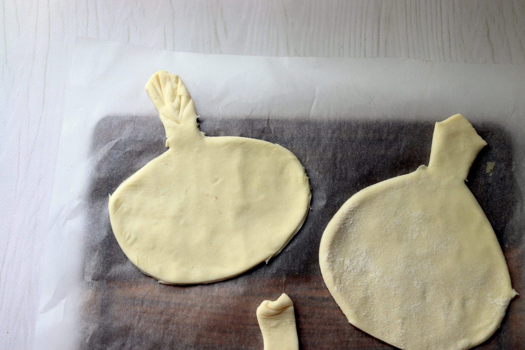 Cut the puff pastry into pumpkin shapes about the size of a dessert plate, once defrosted. Transfer to parchment paper lined baking sheet.