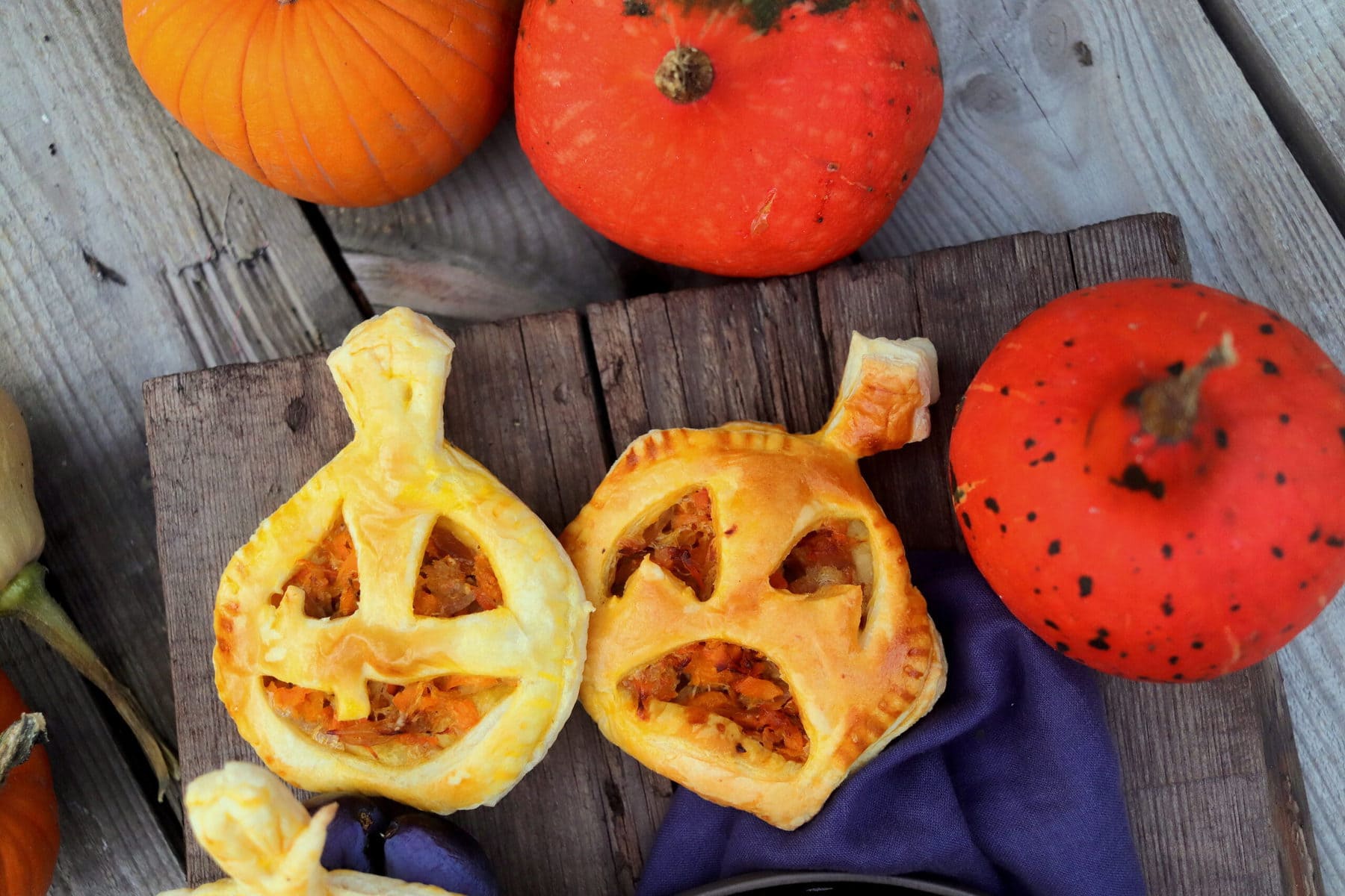 You should be able to get around 3 pumpkins per sheet of pastry dough. Cut out three more pumpkin shapes, the same size as the first, only cut out the face for these ones too. They will be your top layer.