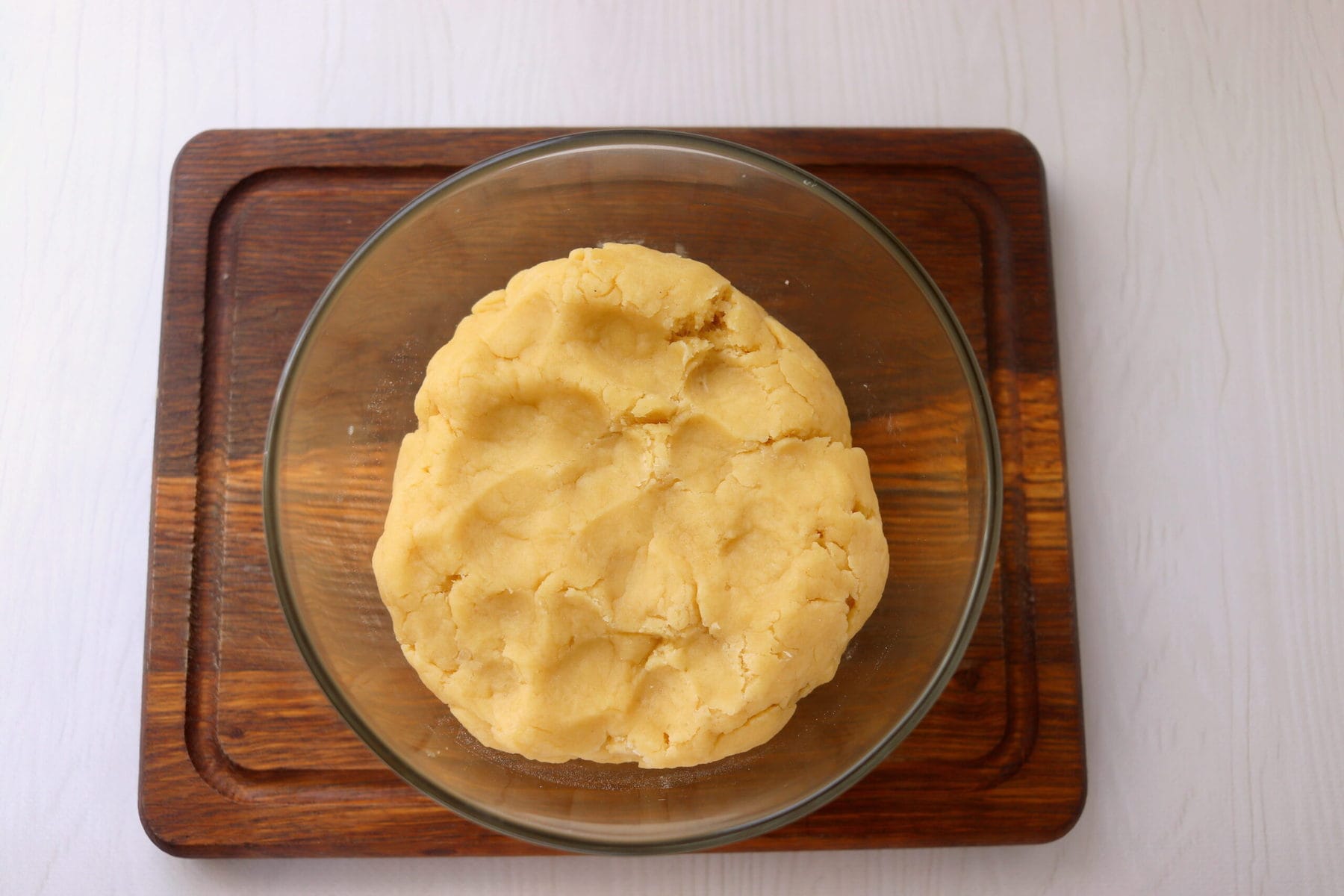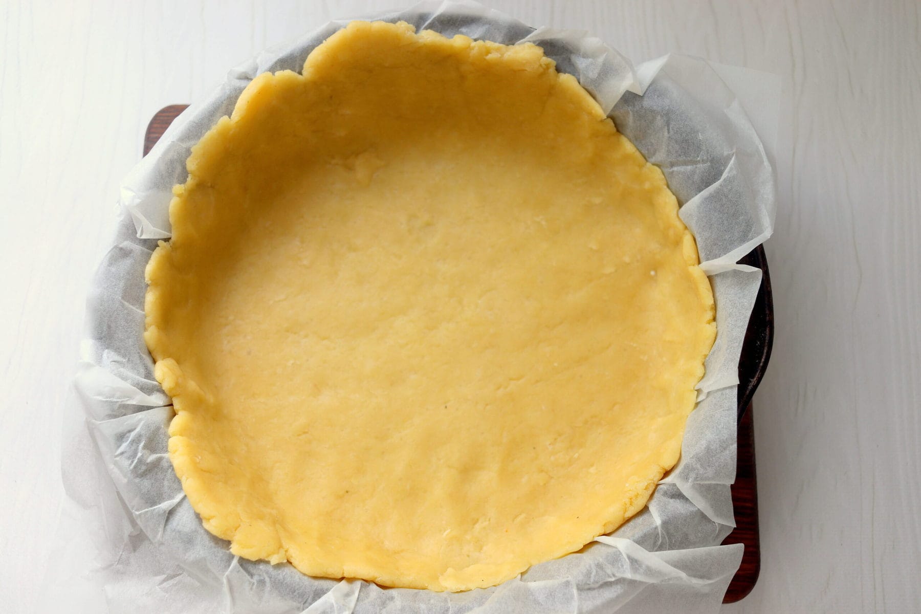Roll out the first part of the cooled dough over a baking dish, and then put the second sheet into a greased pie baking dish. Prick the bottom with a fork, and trim off the excess dough at the edges with a knife. Put it in the refrigerator for 30 minutes more to chill again.