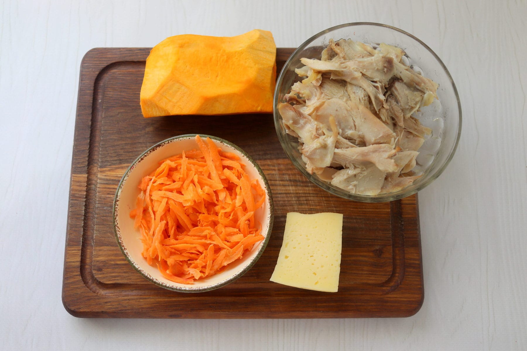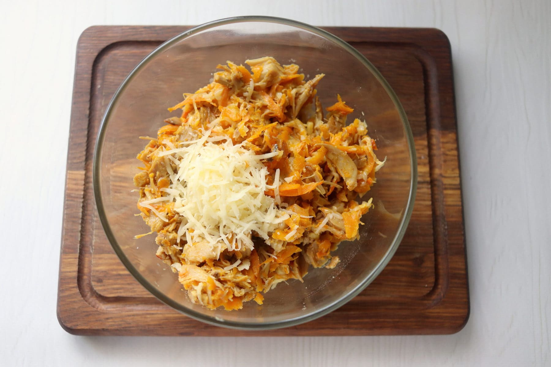 Shred the chicken and add it to the cooked grated carrots and pumpkin.