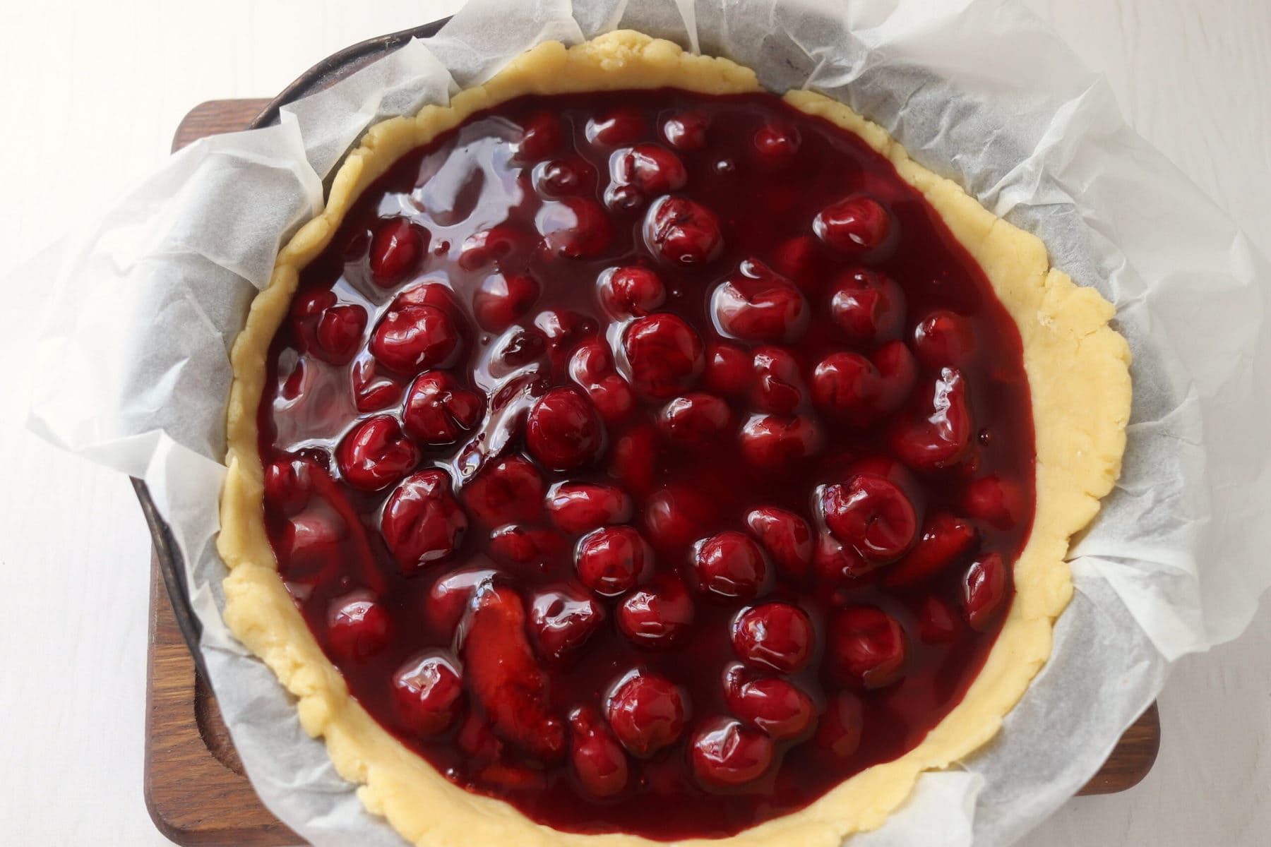 Put the cherries with the syrup in pie pan that has been lined with one sheet of the dough.