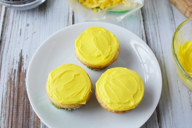 Start by making your cupcakes and frosting them yellow. You can make any kind of cupcake you choose.