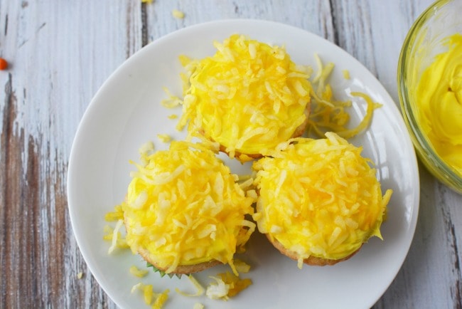 - While cupcakes are cooling add approx. 5 drops of yellow food coloring to your coconut flakes, and mix in a bowl (you can add more or less depending on your color saturation preference).