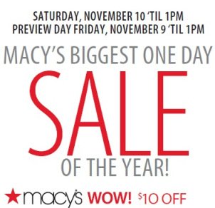 Macy’s has another great coupon available. Get $10 off a $25 Purchase WOW! SavingsPass. This coupon is valid today and tomorrow only (11/9 & 11/10) and ONLY until 1pm.