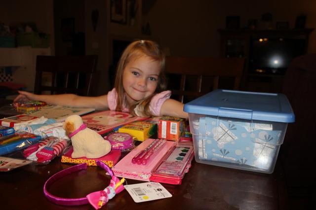 This year, our girls each packed their own box (my 4 year old packed a box for a 2-4 yr old girl and my 6 year old packed a box for a 5 – 9 year old girl). They each picked out everything that would go inside of the box, with just some ideas from us on the necessities.