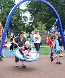 I can confirm, it was a park with fun for all. We had kids with us ranging in ages from 2 to 12 and all had fun (it was more of a stretch for the 12 year old to stay active though). There are climbing walls and winding slides, a huge sand play area, modern versions of teeter totters, saucer swings, an in-the-ground merry go round, climbing rope web and more. It is all built on soft foamy rubber, so there is less concern of injury for your kids while they are playing.