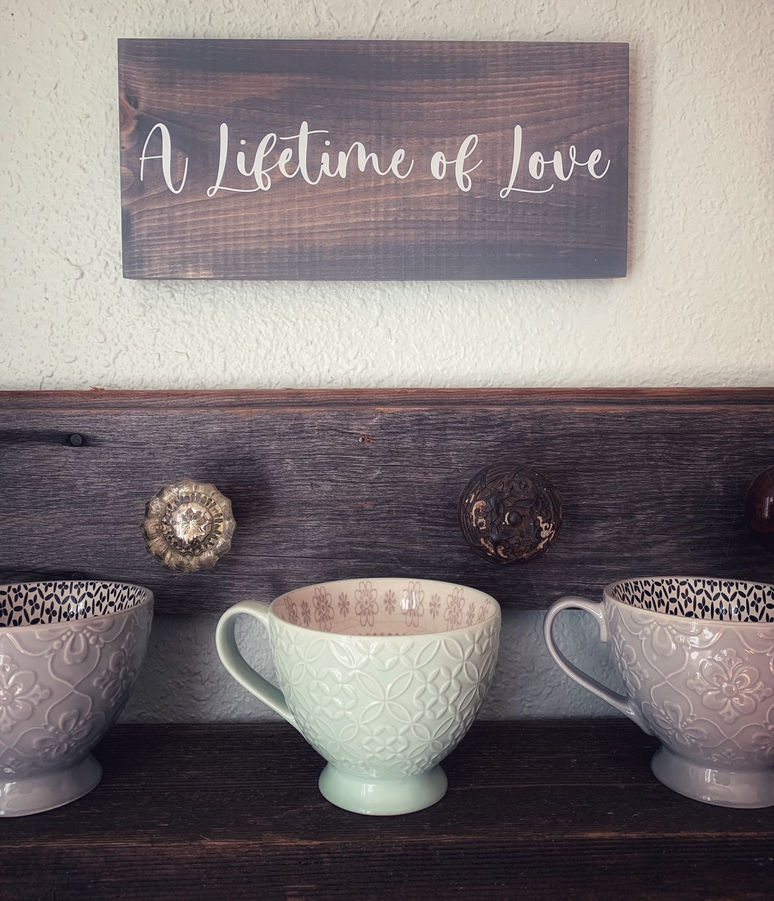 I ordered this “A Lifetime of Love” sign separately, so my mom can hang it above her custom personalized photo gift (the birch sign), but you can also order these to use for home decor too. You choose the wood stain, the font color and type, and then the saying you want printed on it. It