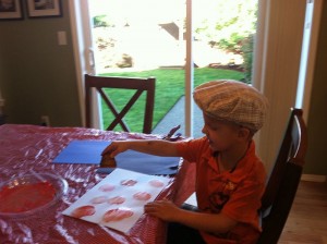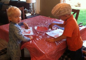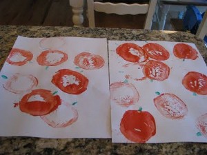 I usually place the paint on a thick paper plate or aluminum pan, cover the table with an old table cloth and then hand the boys the potato stamp to go to town. After the “pumpkins or apples dry, the boys then used green ink from a stamp pad to make stems with their fingerprints.