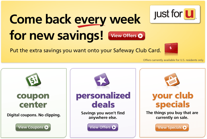 You will need to start by signing up online at Safeway.com. Select the Just 4 U program and you will have to register your club card. You will then have access to the Savings Center which should include: