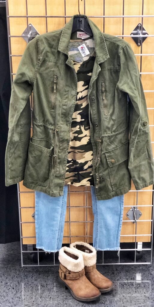 My kids bought lots of camo this year. I love this pattern, and the colors for myself too. We found a number of camo pieces at big discounts. This camo shirt is just $2.99! When we put this outfit together, a couple of other folks who were in the store shopping walked by and commented on how cute it was. The best part is the total outfit from top to bottom (coat, jeans, shirt, and shoes) was just $28.96 plus tax! And with the $5 off $15 coupon we mention above, that brings the total outfit price down to just $23.96! That includes a coat and shoes – its hard to find shoes for that price alone.