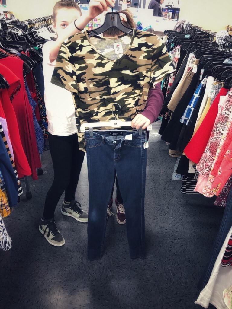 Or another simpler version of the outfit my girls found above, Hollister jeans and camo top, would be just $13 for the entire outfit ($2.99 for the Camo t-shirt, and $9.99 for Hollister jeans). You would likely pay $10 for shirt and $25 to $45 for jeans) so you are saving quite a bit. You can see from these current years examples, how you can shop thrift for current styles, but see big savings.