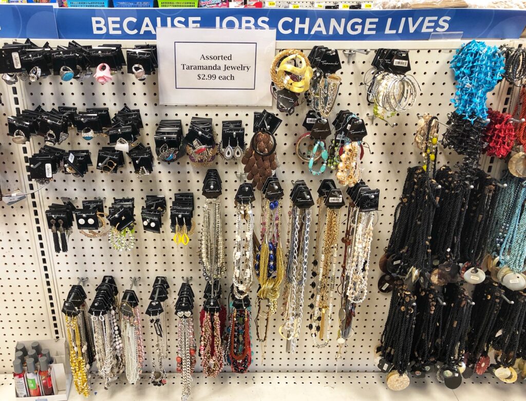 We found an entire wall of accessories, all brand new, for just $2.99 each! There were necklaces, earrings and more. Goodwill can be a great spot to look for accessories like belts and designer bags at discounts too. We also found some great deals on brand new packs of socks throughout the store (many of these were displayed on end caps.