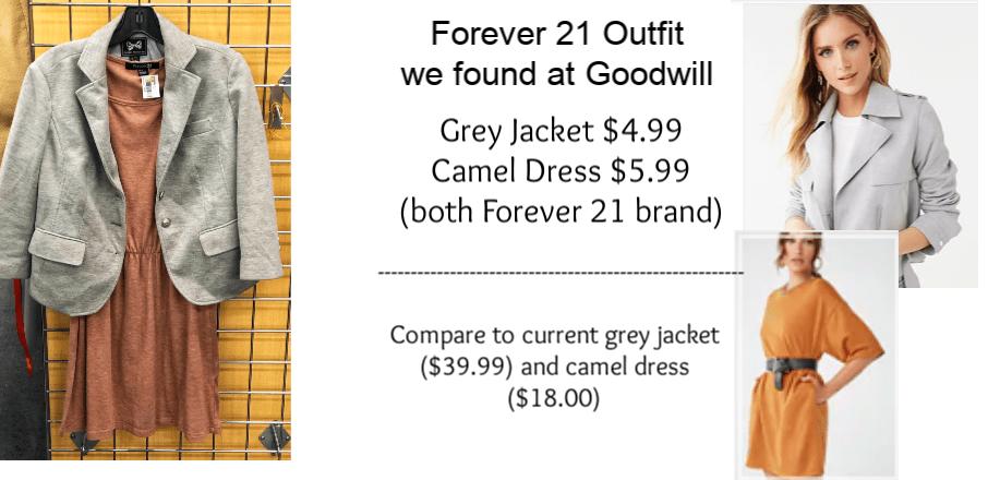Goodwill is always fun to look for more traditional thrift styles (kitchy tees, etc), but it is also a great spot to look for name brand items at huge savings. You can find some great deals on brands your kids like to wear at significant discounts over buying them brand new. We found things like Nike, Adidas, Forever 21, Rue 21, Old Navy, American Eagle, and many other brands the kids shop for in the stores. See some of the outfits we found on our shopping trip yesterday, and how they compare to similar items currently in store. We found the Forever 21 outfit shown above for much less then you would pay for just one of the pieces in the mall right now.