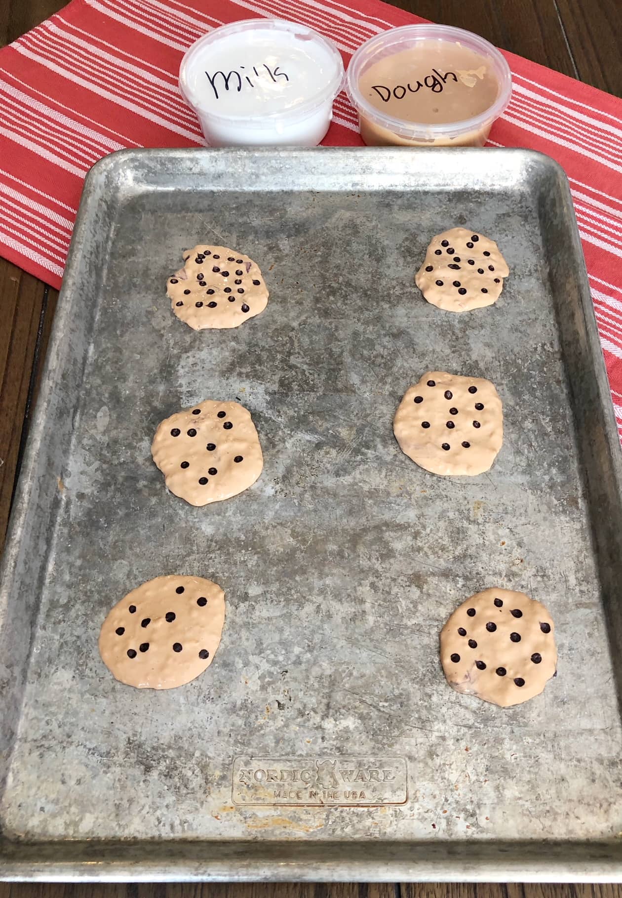Once you have the slime “cookie dough” ready, make cookie shapes and lay them out on a cookie sheet (roll into small ball and flatten, just like you would regular cookie dough).