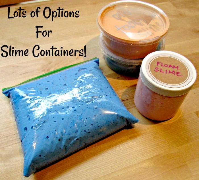 Once the kids have made a batch of slime, they will need something to store it in. My kids love containers of all sizes (from small condiment cup sizes for sample slimes, to shoe box size plastic containers for giant slimes). Something that is around 6 to 8 oz is a good starting size for most slimes, and usually kids can get a couple of containers full out of one batch of slime.