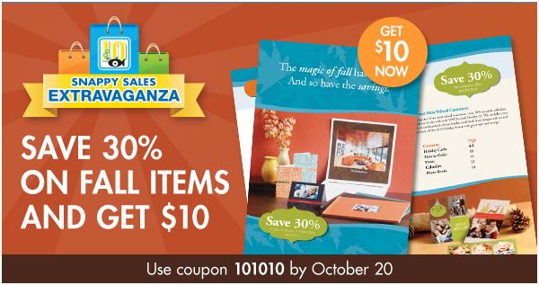 Snapfish is having a great sale today only, in honor of 10/10/10. You can get 30% off any purchases from their fall E-catalog today only. In addition, you will get a $10 credit put into your Snapfish account in 2 business days. All you need to do is make sure to select an item(s) from the Fall E-Catalog & then use the coupon code: 101010 at checkout to save 30% & receive the $10 credit in 2 days.