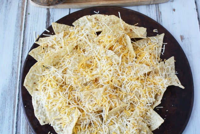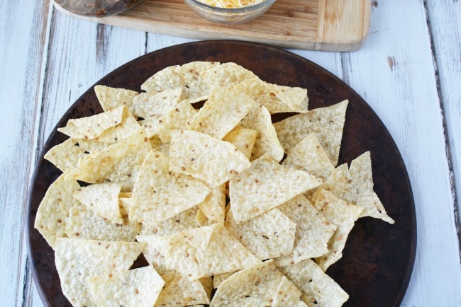This recipe is so simple, start by preheating your oven to 350 (or you can broil them, but watch closely if you do this so you do not burn your chips or cheese).