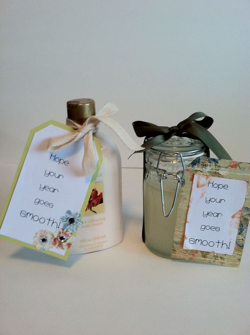 Another favorite idea that is so versatile is using the saying: “Hope your year goes smooth!” on a tag. Attach the tag to a bottle of lotion, body scrub, a jamba juice gift card, lip gloss or a cookbook of recipes for smoothies.