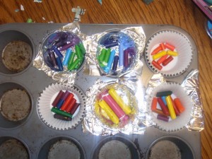 As far as which liner worked best, I think it’s a wash. Although I’m glad I used so many paper ones in each spot because the wax did go all the way to the outer paper. In which case, if I had foil in abundance I’d probably use foil as the crayons melted so much faster in foil.