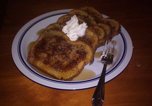 This is a french toast recipe that I came up with and it became an instant favorite. We had this for breakfast this weekend, but it’s also a hit for breakfast-for-dinner. I combined a couple other recipes to get this result. Admittedly, it is pretty sweet, but it it was certainly a hit at our place. By the way, day old bread tends to hold together better than  fresh bread once you dip it in the batter (and it’s often cheaper!). Of course, regular, thin sliced bread, works well too!