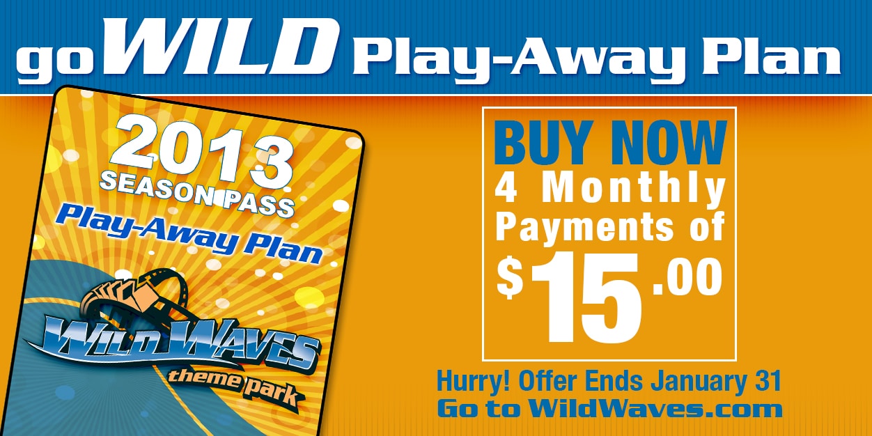 Wild Waves has a special offer only available till January 31, that may help make an annual pass more affordable. The Play-Away Payment Plan for a 2013 Season Pass allows guests, perfect for moms, to make 4 monthly payments of $15.00*.