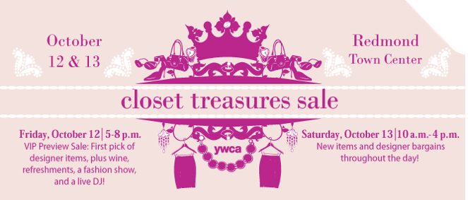 This Saturday, October 12th & 13th, the YWCA is holding their 10th Annual YWCA Closet Treasures Sale at the Redmond Town Center to benefit clothing services programs for the YWCA’s of Seattle, King County & Snohomish County.  They will be offering a wide selection of new and gently used designer & name-brand clothing items. You can visit the Styles of the Sale blog for a sneak peek at some of the fashions that will be available.